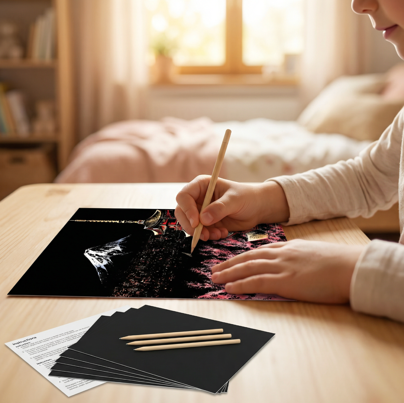 Un kit à gratter est une activité créative et relaxante où vous grattez la surface grise d’une illustration pour révéler de magnifiques couleurs ou motifs cachés. C’est un moment de détente accessible à tous, sans besoin de compétences artistiques
